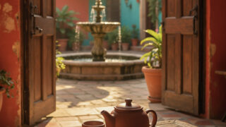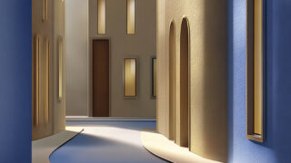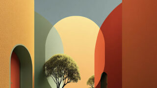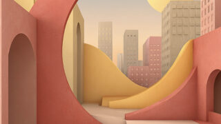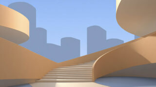柔らかな光と曲線的な街並みが印象的なミニマル建築背景。洗練された都市デザイン素材です。
