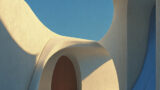 曲線的な建築と柔らかな光に包まれた抽象的なミニマル空間デザインです。中央の木がアクセントとなり、幾何学と自然が融合した洗練された背景素材です。