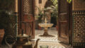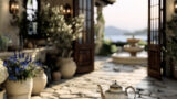 海を望む開放的な空間でのティータイムを描いた背景素材です。青い扉と柔らかな自然光が、爽やかでリラックスした雰囲気を演出します。カフェ風デザインや癒し系コンテンツに最適な背景素材です。